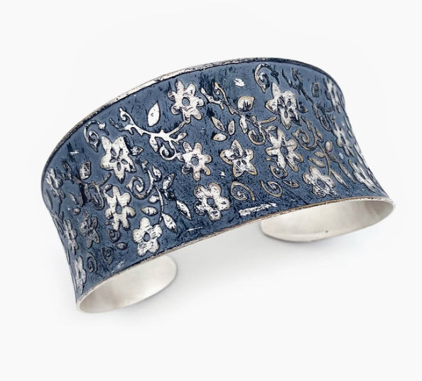 Periwinkle Bloom Patina Adjustable Cuff Bracelet The Periwinkle Bloom Cuff is a handcrafted bracelet featuring a periwinkle enamel finish adorned...