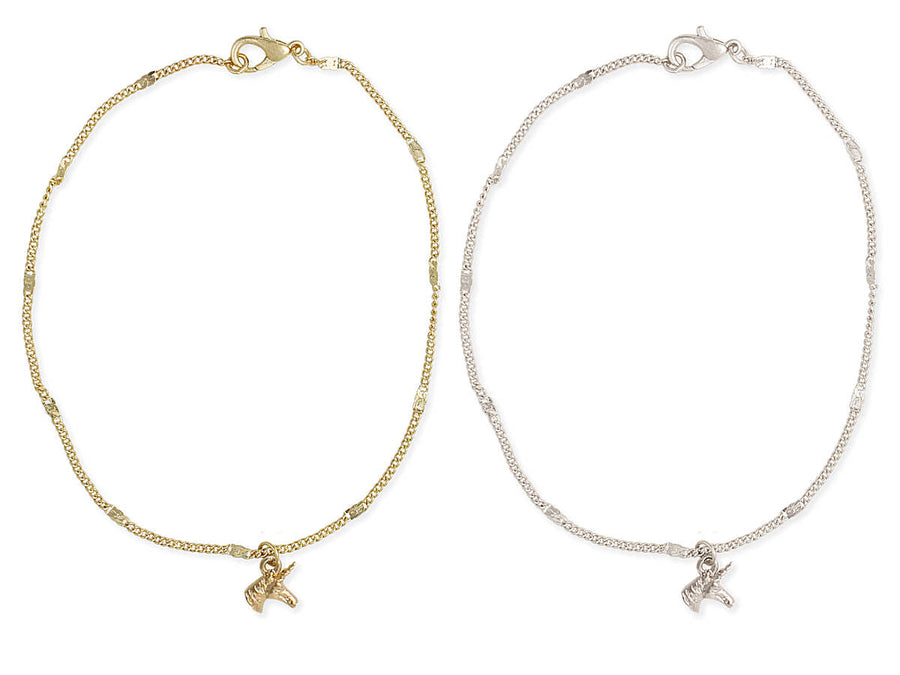 Ready to make some fashion magic? Slip on this unicorn charm anklet and entice enchantment. Shiny gold and silver plate...