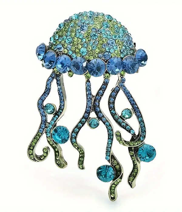 Blue and Green Jelly Fish Brooch covered with Rhinestones Size: 2.28" x 3.43" (approx.) Material: Made of metal alloy with...