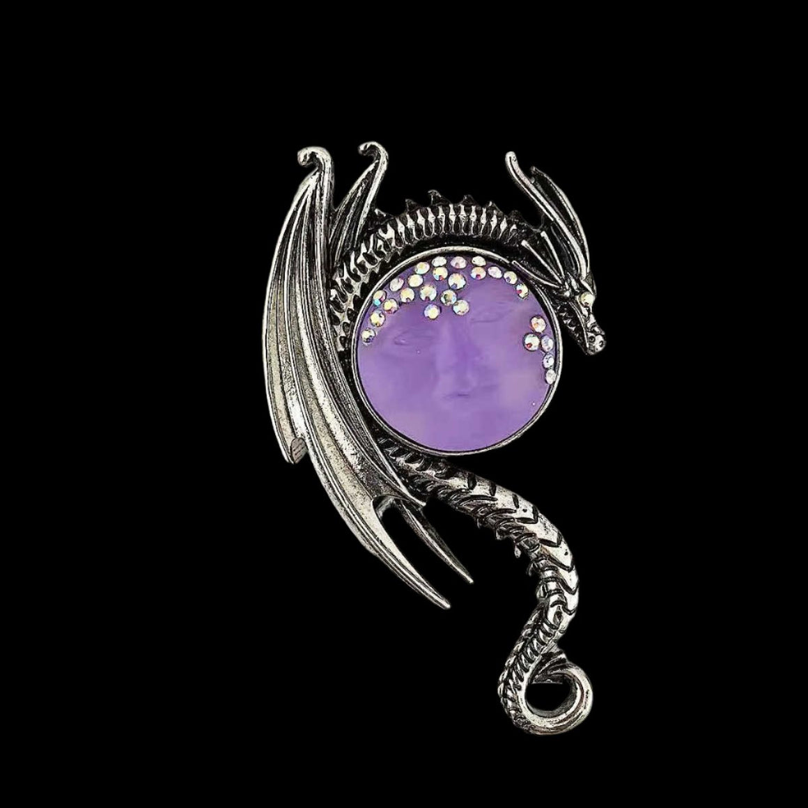 Dragon and Rhinestone Moon with Irrisdencent Purple Face Pin Material: Zinc Alloy Size: 3" L X 1.75" Measurements are approximate...