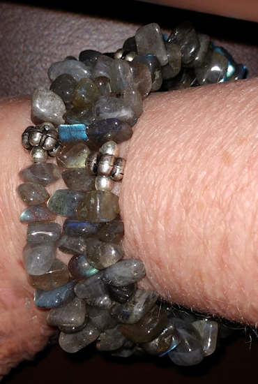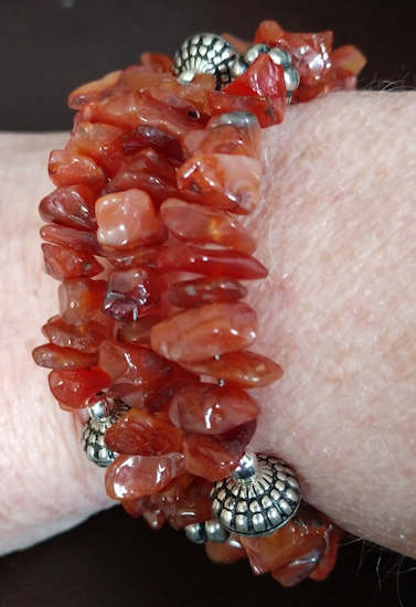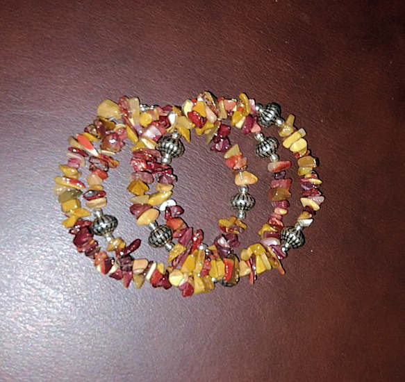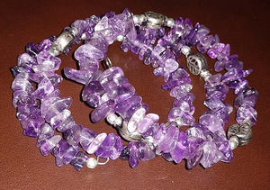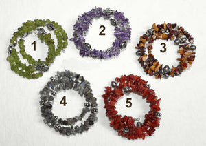 The gemstone chips are interspersed with assorted design silver metal beads.