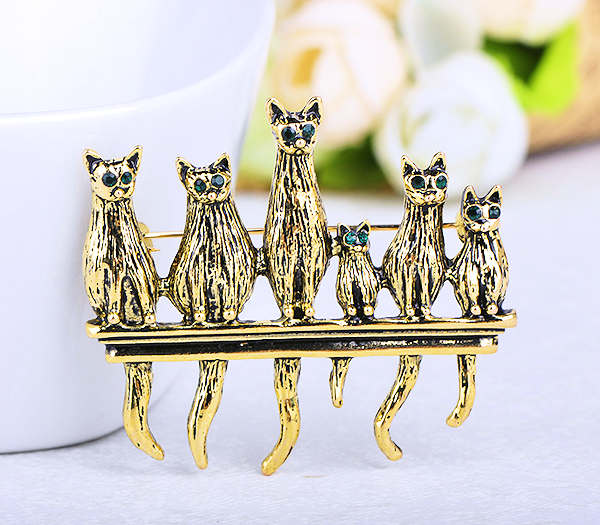This Vintage Style Cat Brooch features six cats with sparkling green crystal eyes. Metal Type:Â Tin Alloy Antique Gold or...