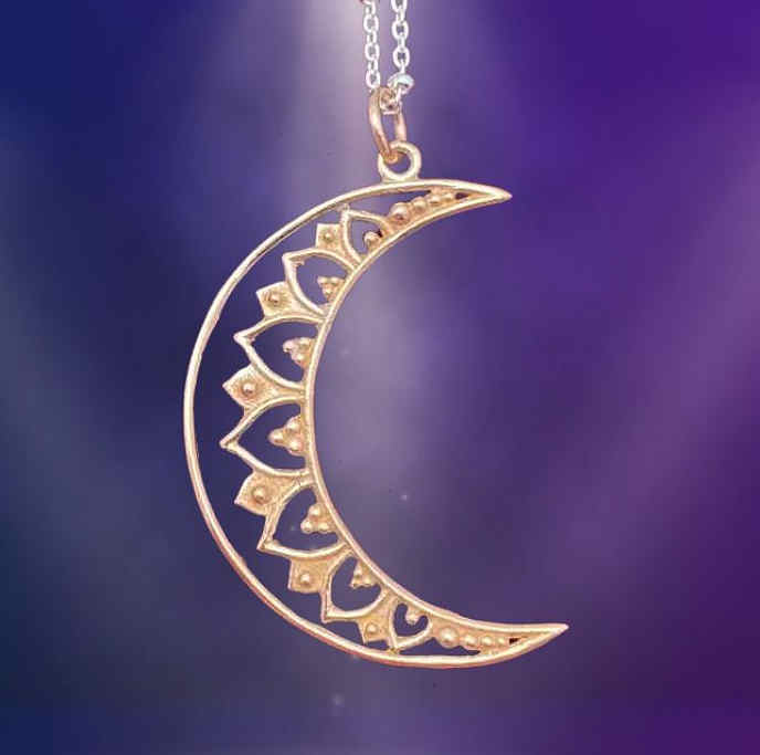 This intricate bronze mandala moon necklace is paired with a sleek, shining Sterling Silver chain.
