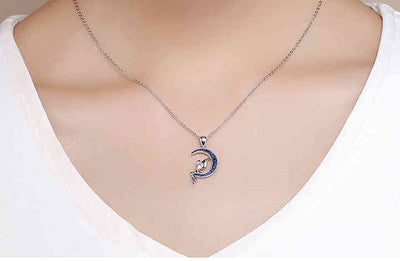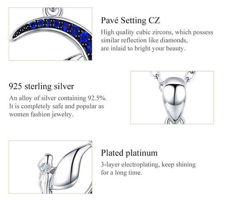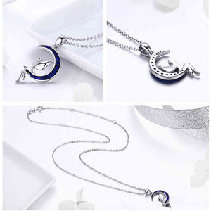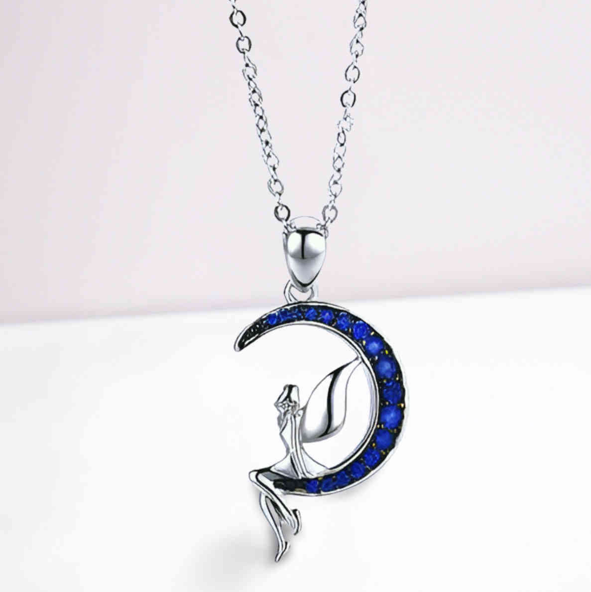 Glimmering sterling silver fairy twinkling in her blue crystalline crescent necklace!