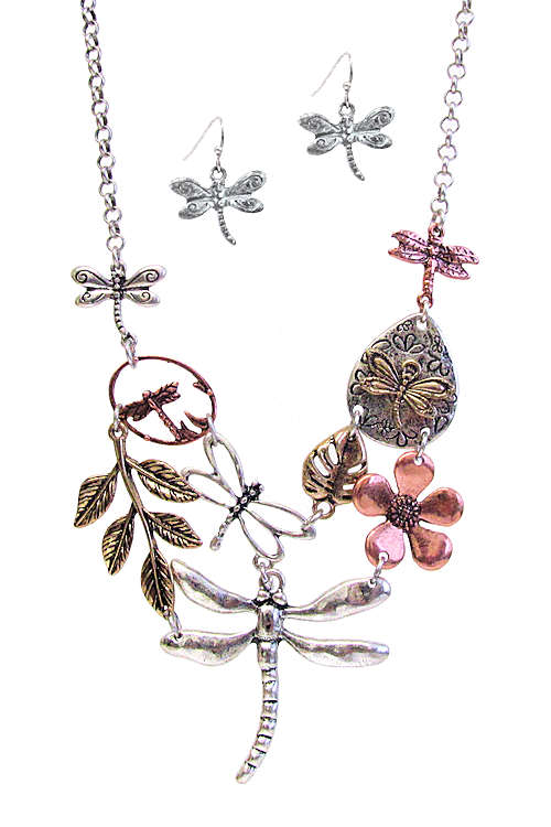 Get ready for some dragonfly magic with this Burnished Silver Toned Round Pendant Necklace & Earring Set - a must-have...