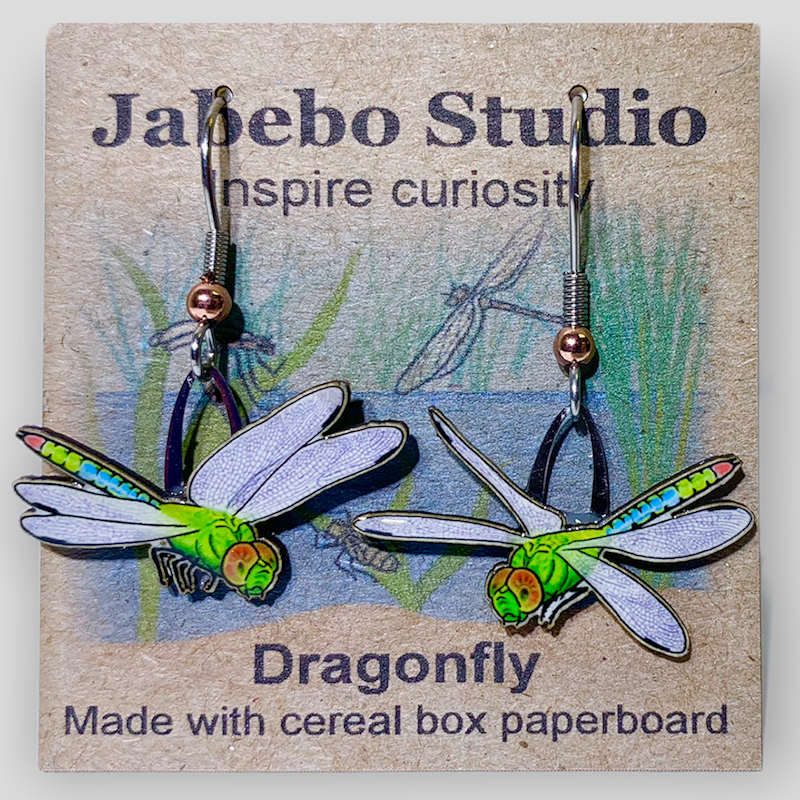 There is nothing like seeing dragonflies as they dance over your flowerbed or meadow.  These earrings are made with recycled cereal boxes - so Eco-friendly and beautiful. Dragonflies face each other.