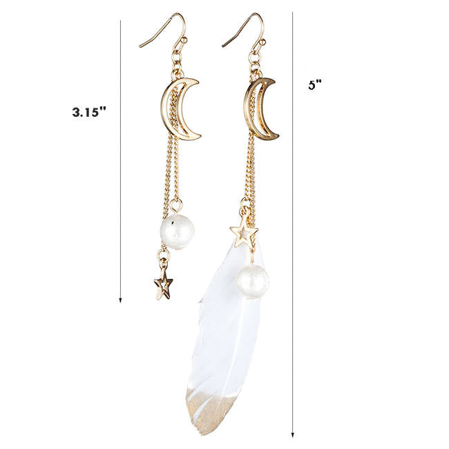 Earrings with White Feather Earring with Gold Tip and Moon Star Asymmetric With beads and long metal chain tassel Metal Type: Zinc...