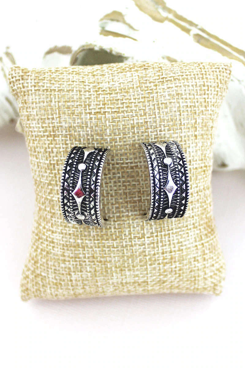 Refresh your look with Western Inspired Hoop Earrings Burnished Coppertone or Burnished Silvertone Raised Diamond, Triangle, Dot, and Line Detailing...