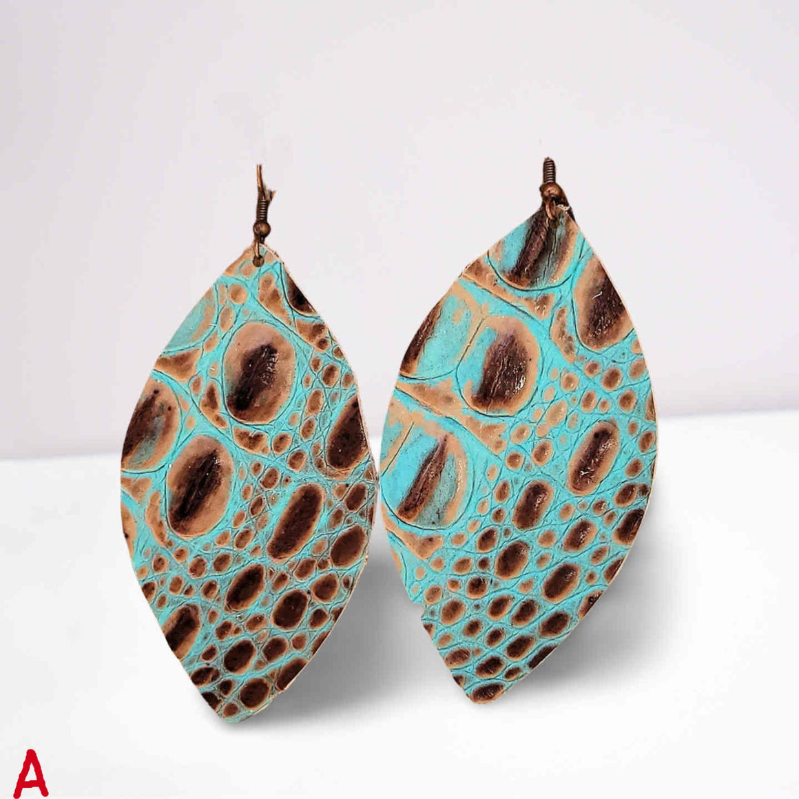 These Handcrafted Leather Embossed Earrings feature an American-made Gator Type Texture in contrasting Brown and Turquoise. Length: 3.5", Width: 1.625"...