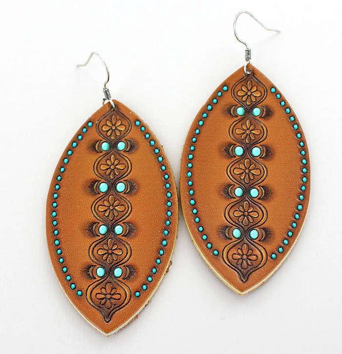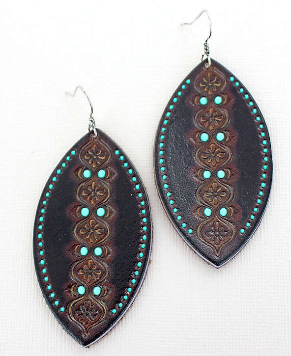 Crafted from genuine leather, these handcrafted, embossed earrings have a Turquoise stone accent. Length: 3.5", will vary based on size...