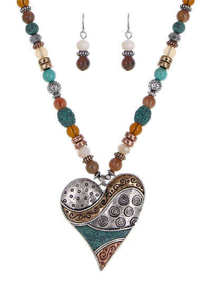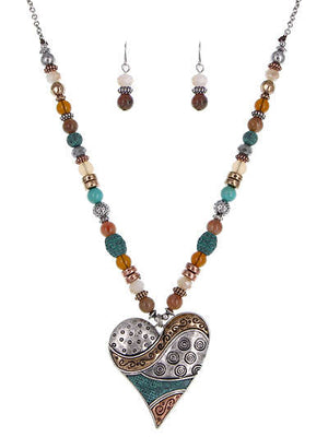 Long Beaded Necklace and Earrings with Fabulous Heart Pendant