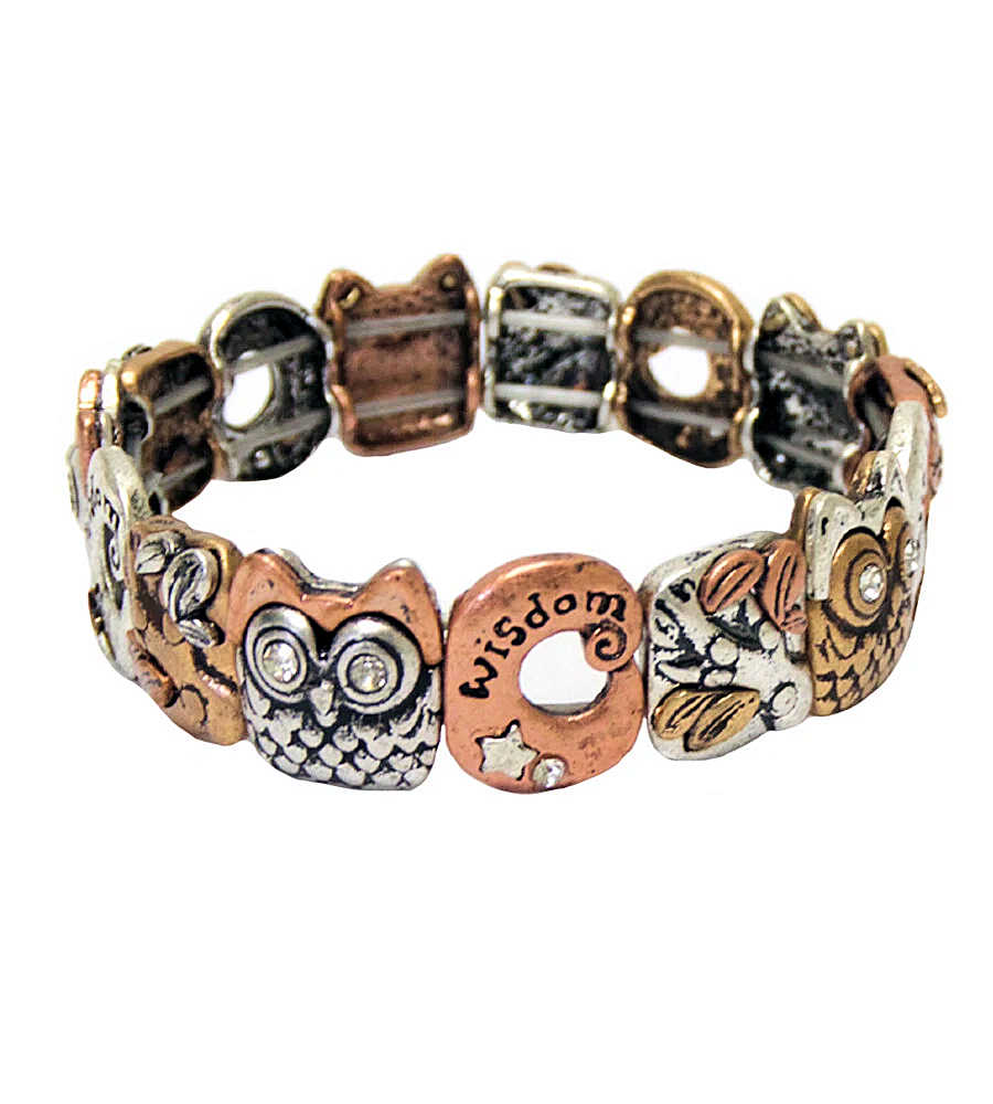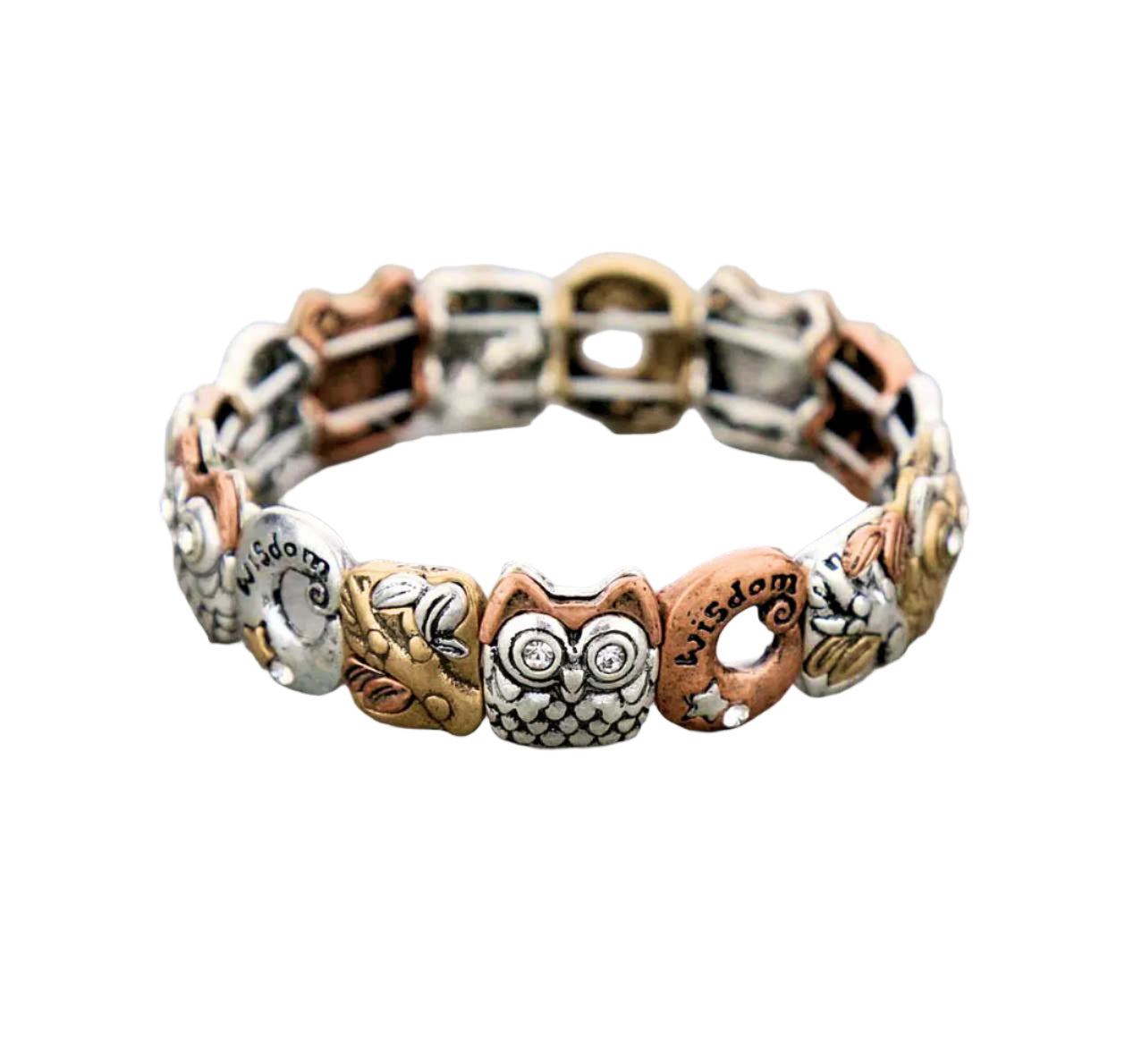 Our Owl Wisdom Bracelet stretches to fit your wrist showcasing a family of owls in three different burnished metal tones.