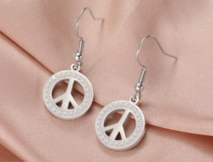 Stainless Steel Peace Sign Earrings with Rhinestones
