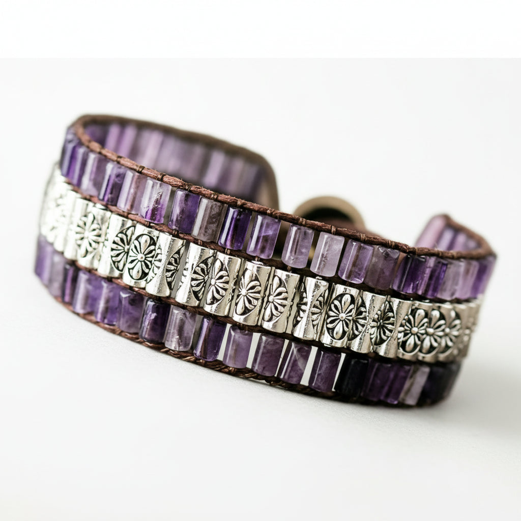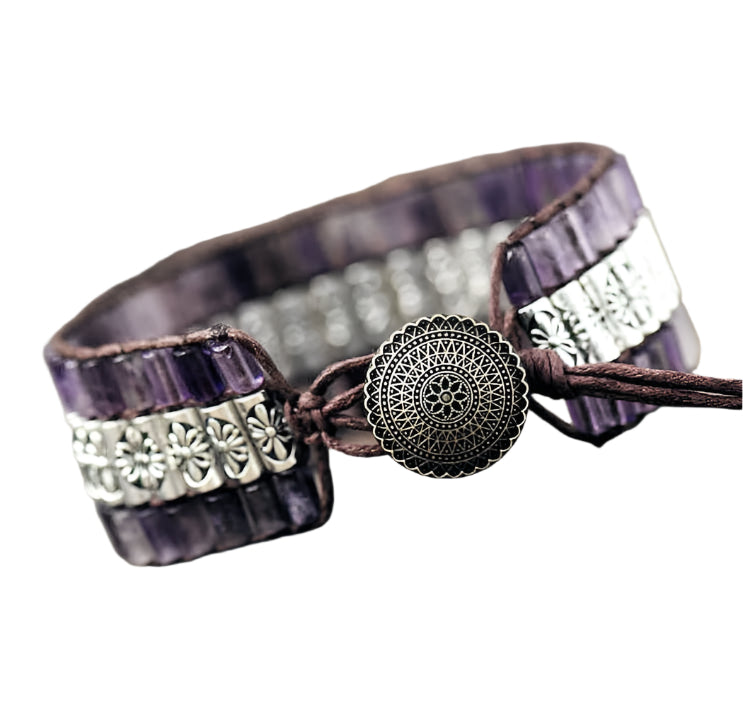 This handcrafted bracelet features amethyst stones paired with antiqued silver-toned beads, intricately woven with leather.