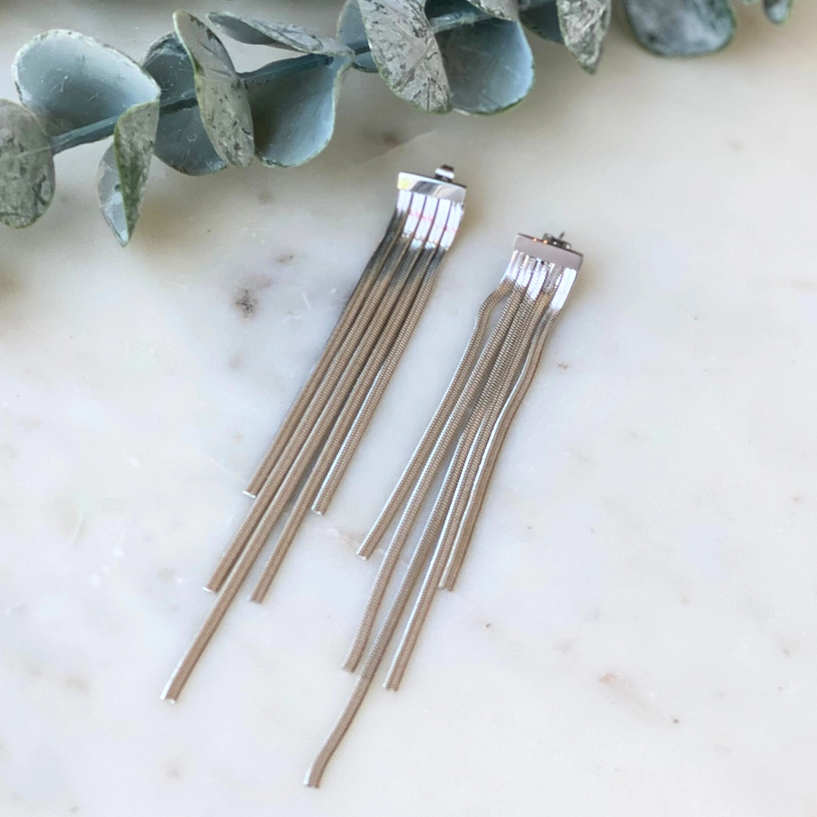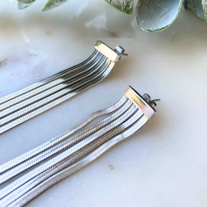 Make a statement with our Tassel Bar Earrings! The exquisite detail of these silver earrings, featuring a snake chain tassel,...