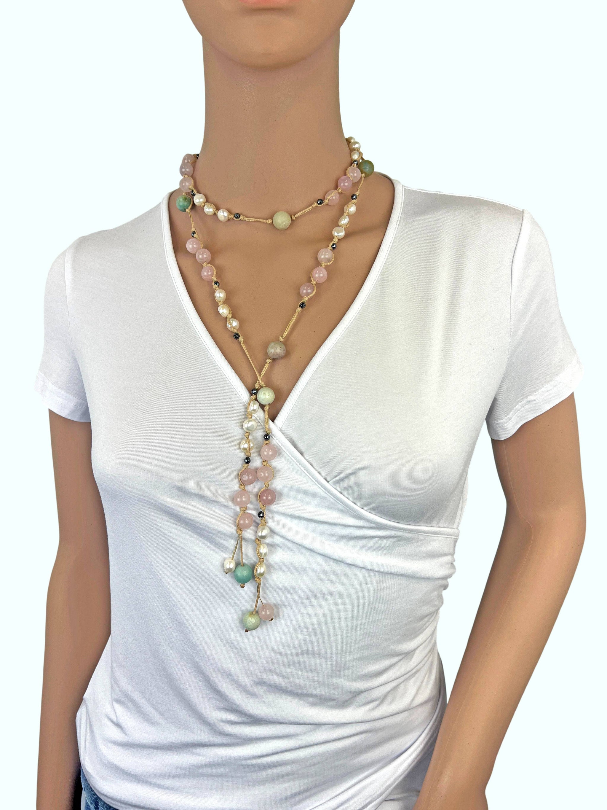 • Materials"  Rose Quartz, Amazonite, cultured freshwater pearls, faceted hematite and beige thread.
