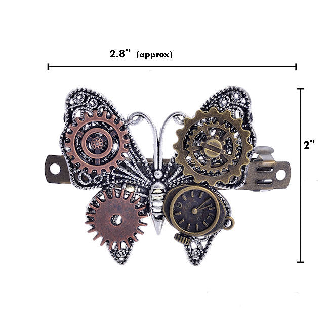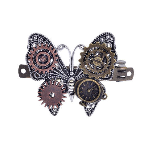 Barrette - Steampunk Butterfly Shape with Gears and Clock