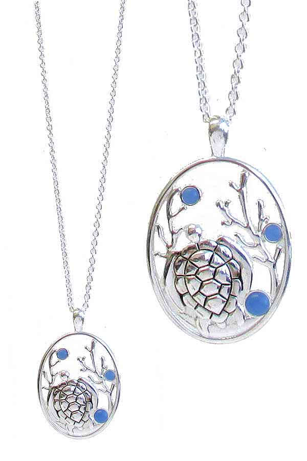 This Sealife Epoxy Necklace and Earring Set features a turtle gliding over rolling ocean waves. Chain Length:Â 18" with 3"...