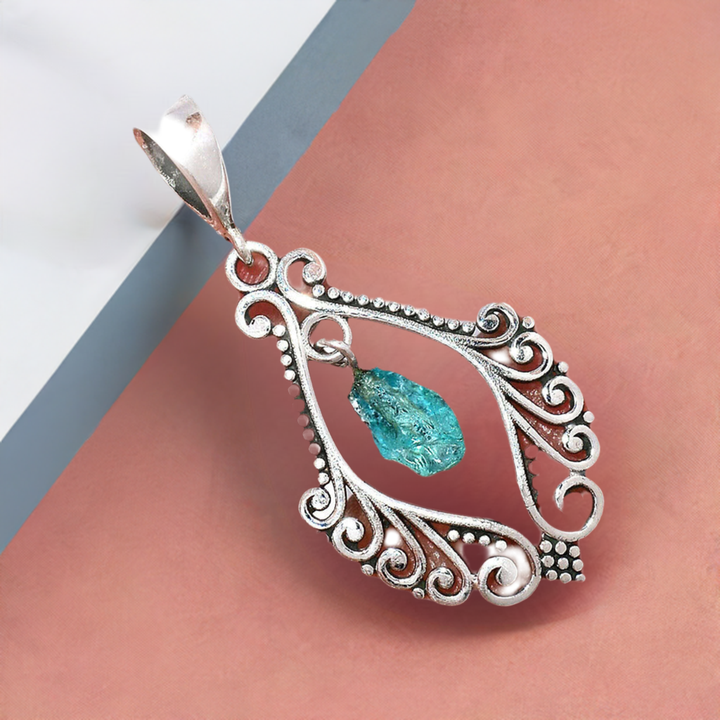 Filigree - Aquamarine Rough - Stone Of Courage .925 Silver Pendant