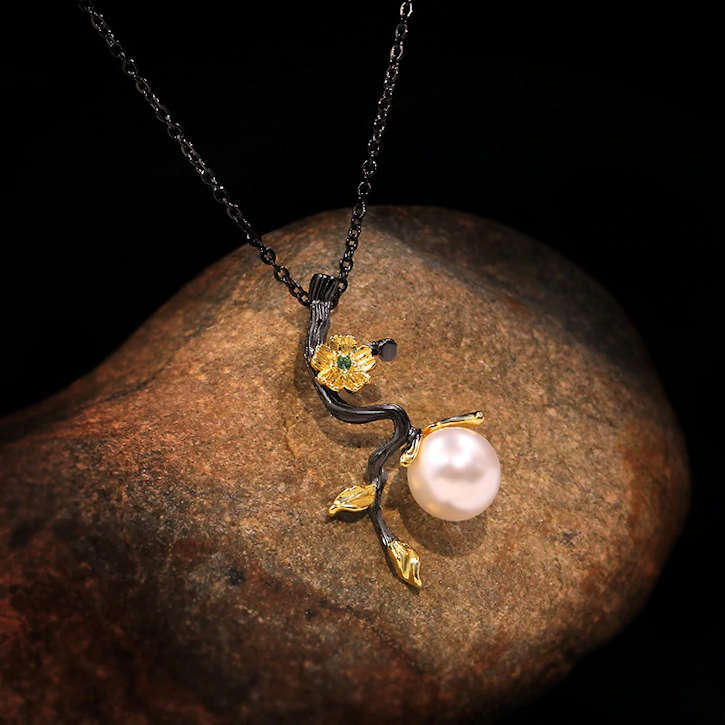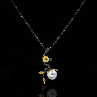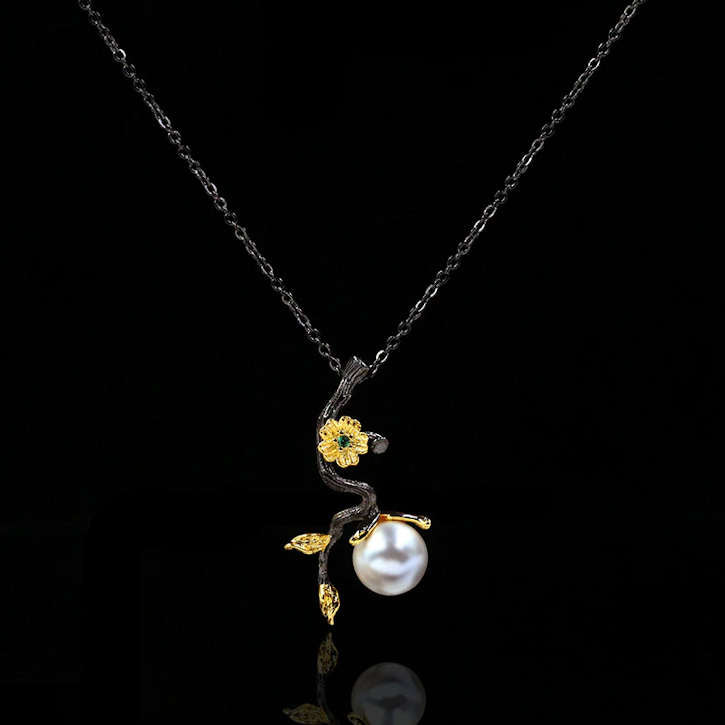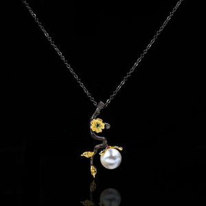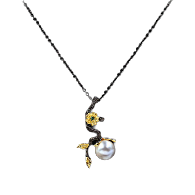 Retro Style "Black Gold" Pendant necklace with Flower, CZ and Simulated Pearl Necklace