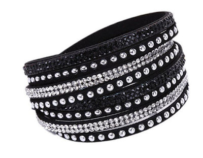 Multi-layered leather and rhinestone adjustable snap closure wrap bracelet