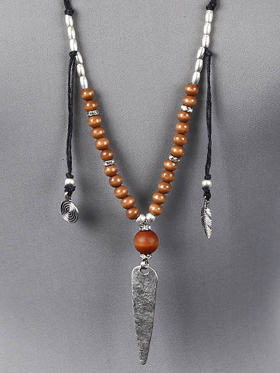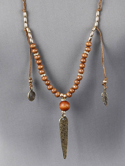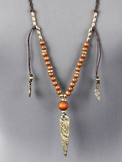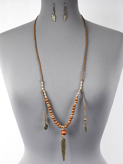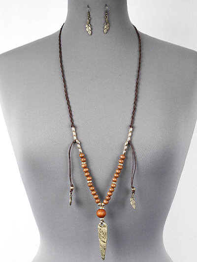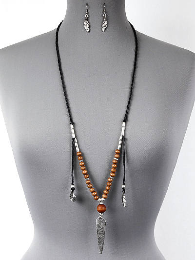 Braided Cord with Feather, Wooded Bead Necklace and Earring Set