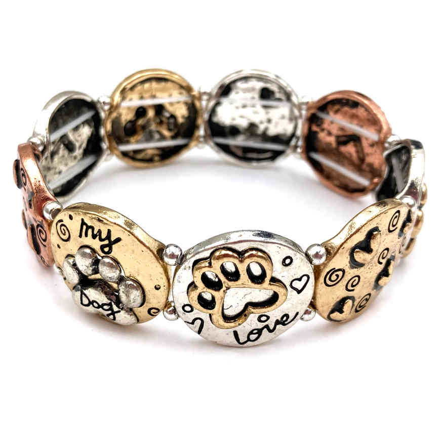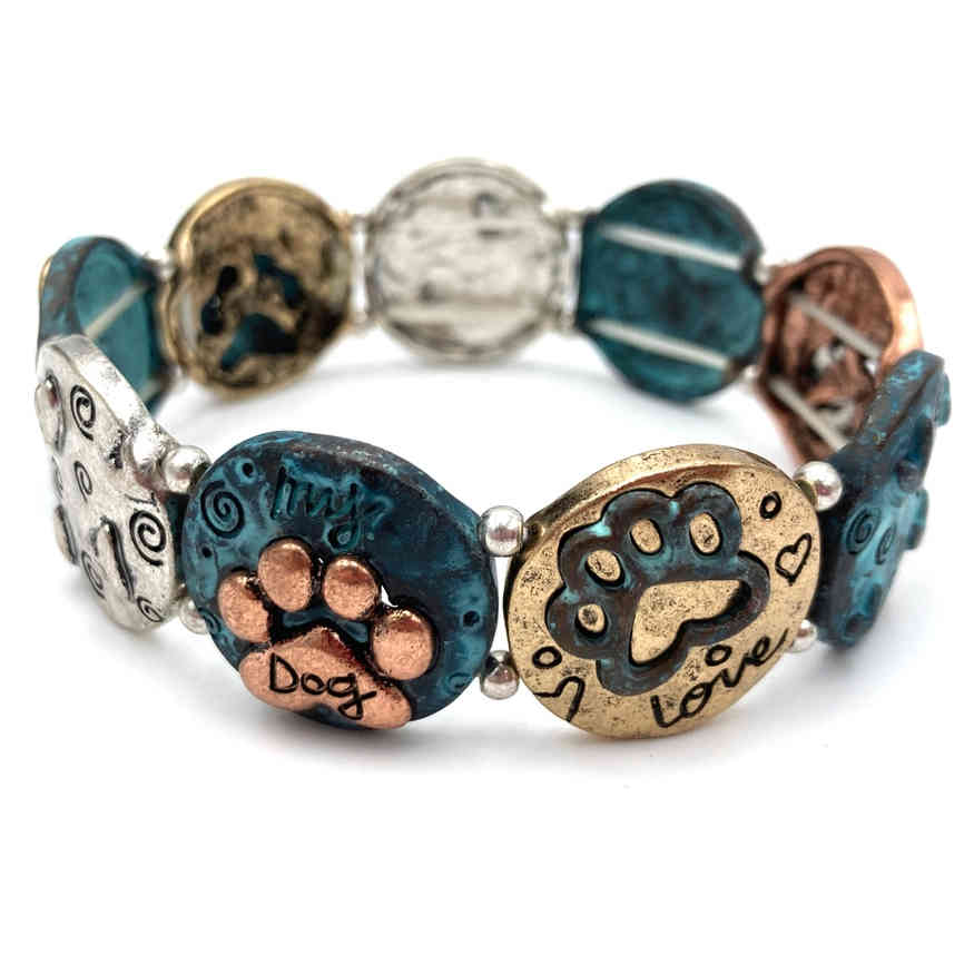 • Vintage western multicolor dog lover bracelet. Paws in different styles and designs. Engraved dog and love words with hearts and swirls.