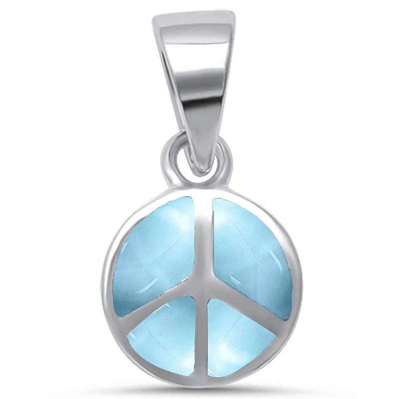 The Silver and Light Blue of this Larimar Peace Sign Pendant is so Eye Catching. Many people wear Larimar to relieve stress and calm fears tempers and calms fears.