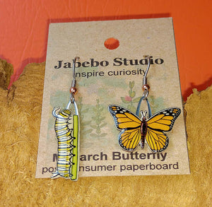 Made From Recycled Materials these MisMatched Earrings Show Species Specific Monarch Butterfly and it's Caterpillar