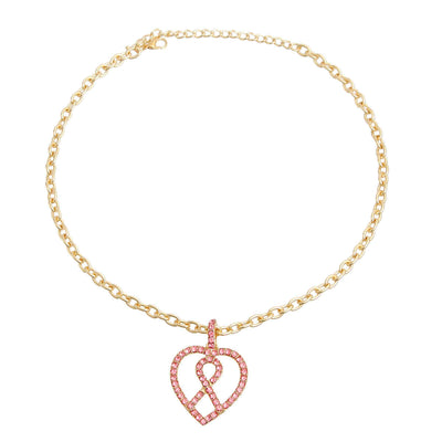 Gold Metal Cable Chain Necklace Featuring Breast Cancer Pendant with Clear or Pink Rhinestone Heart and Pink Ribbon.