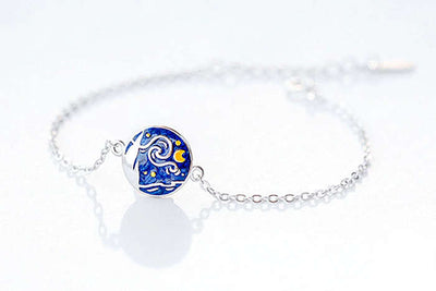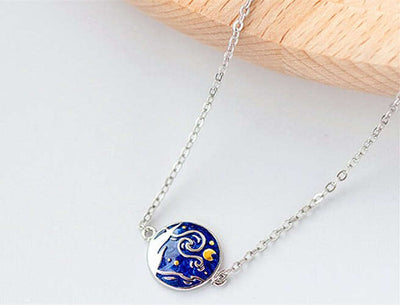 Sterling Silver Stylized Van Gogh Starry Night Necklace with Gold Tone Moon Metal Type: .925 Sterling Silver with blue drip...