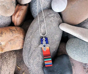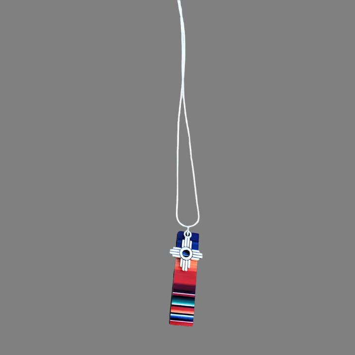 Perfect necklace to add a southwestern flare to your outfit. Beautiful Sarape printed onto wood with a Zia Charm.